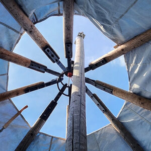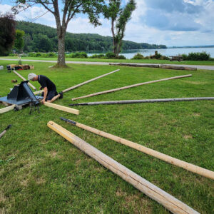 Gleich sind alle Tipi Stangen zum hoch Transport befestigt,